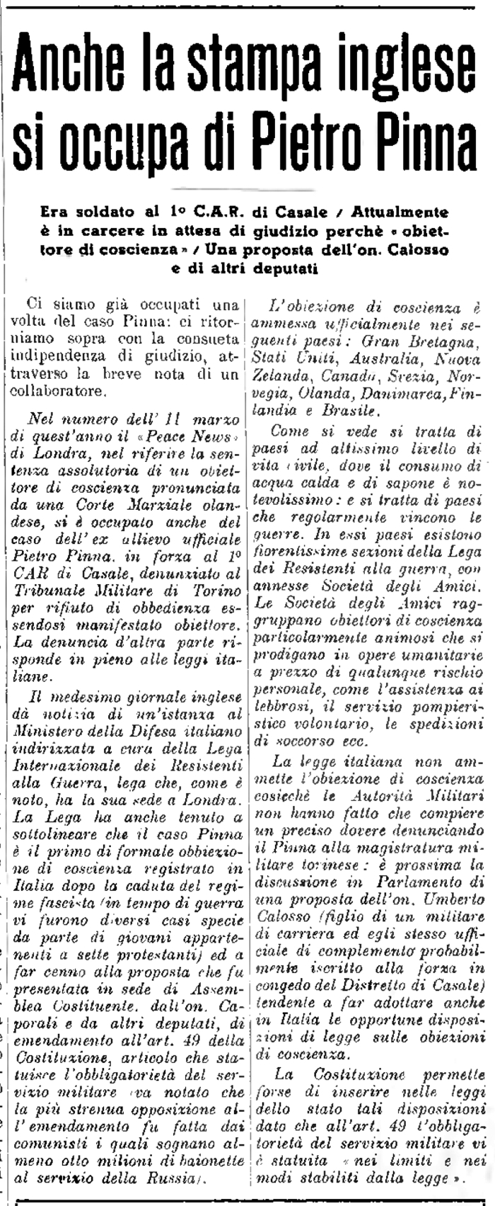 Monferrato, 9 ottobre 1949 Obiezioni di coscienza Articolo su una nuova obiezione di Pietro Pinna |
