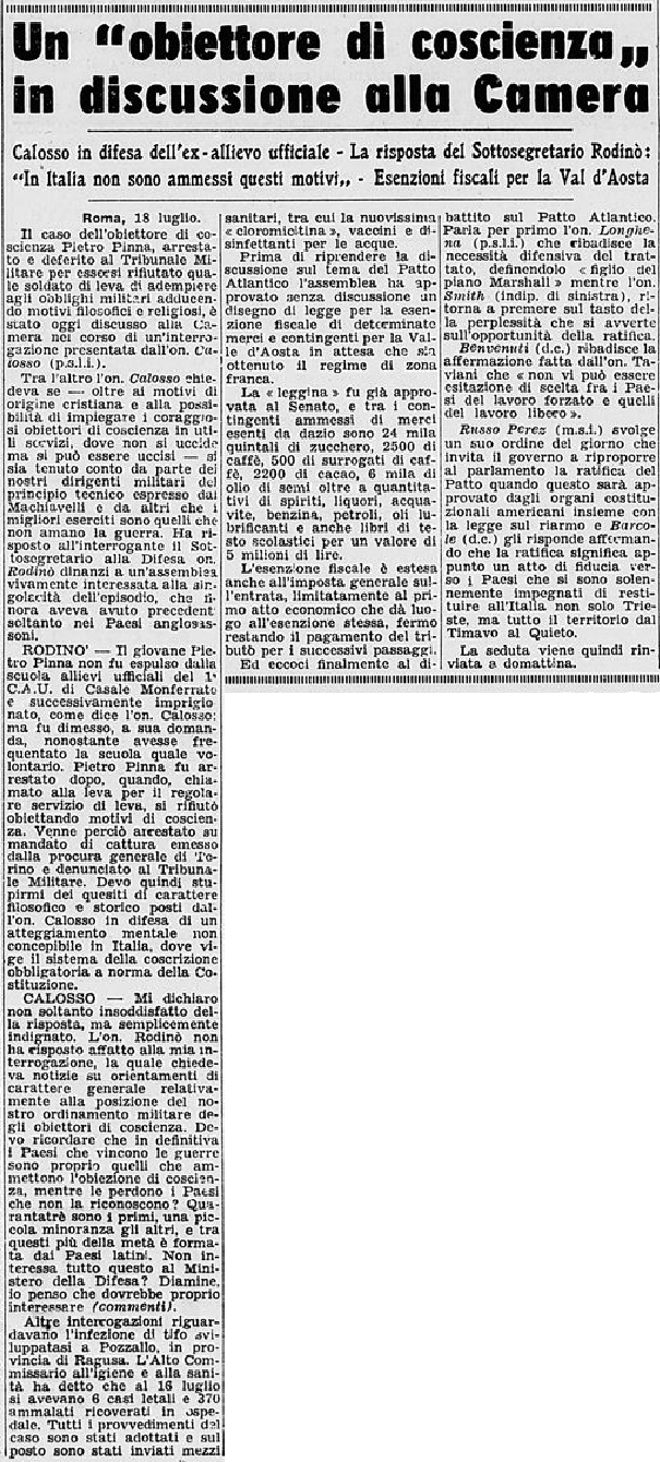 19 luglio 1949 Un "obiettore di coscienza" in discussione alla Camera Interrogazione parlamentare dell' on. Calosso |