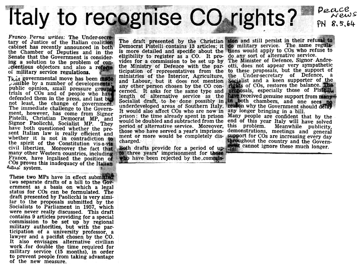 8 maggio 1964 Italy to recognise CO rights? L'Italia riconoscerà i diritti degli obiettori di coscienza? |