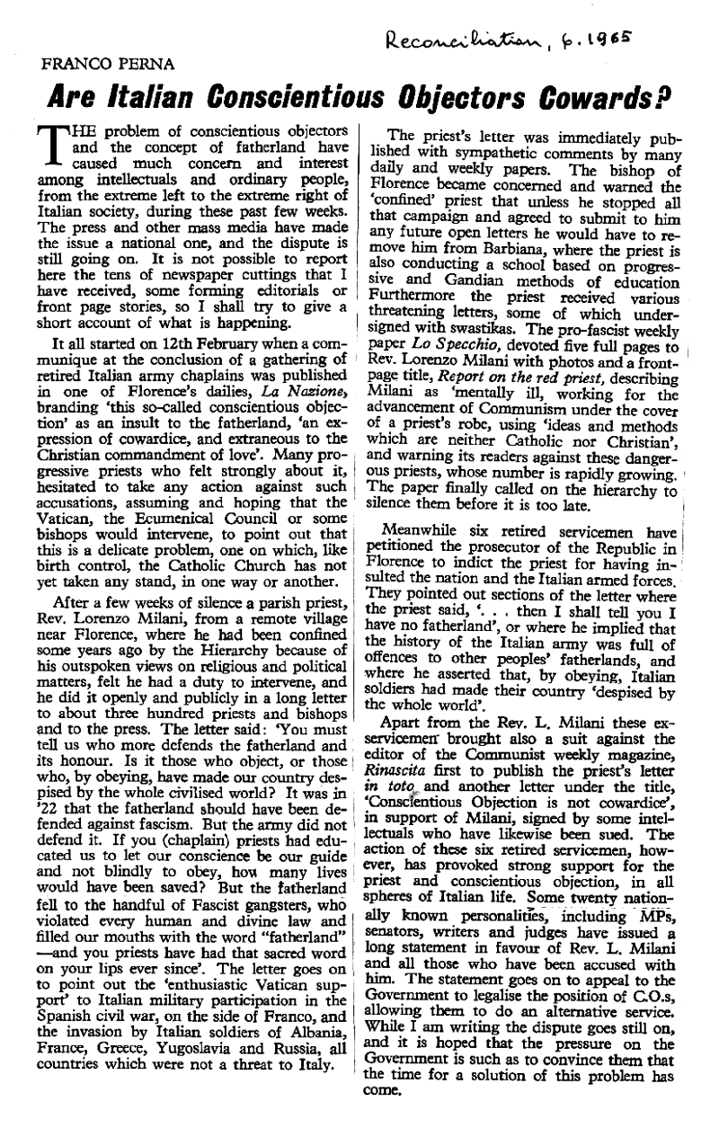 giugno 1965 Are Italian Conscientious Objector Cowards? Gli obiettori di coscienza italiani sono codardi? |