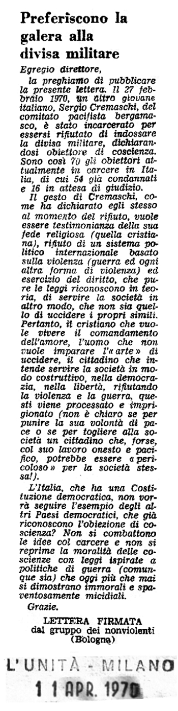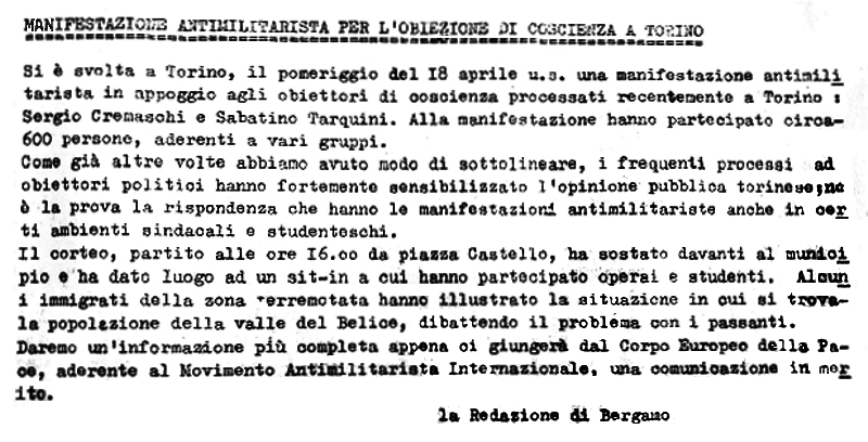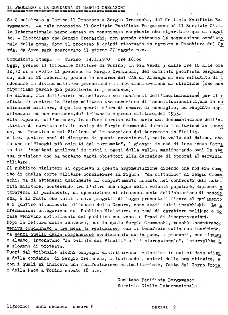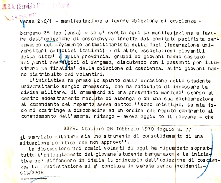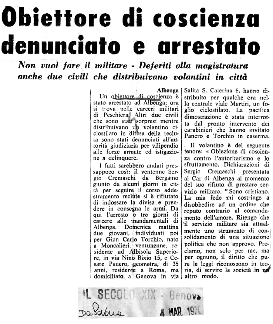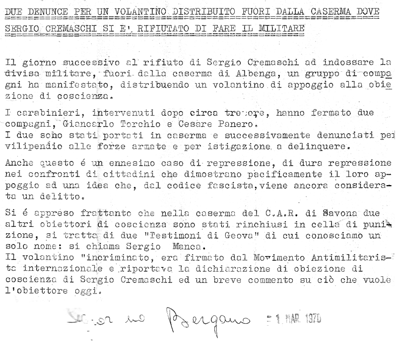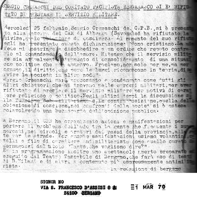 1° marzo 1970 Sergio Cremaschi, del Comitato Pacifista Bergamasco, si è rifiutato di prestare il servizio militare Immagine - Testo |