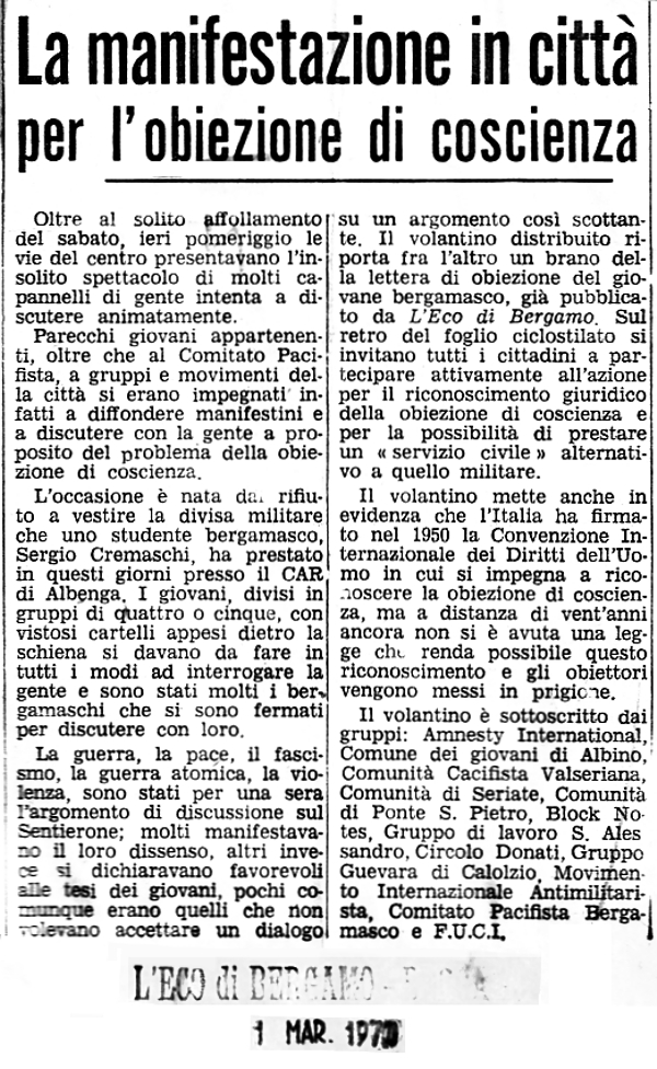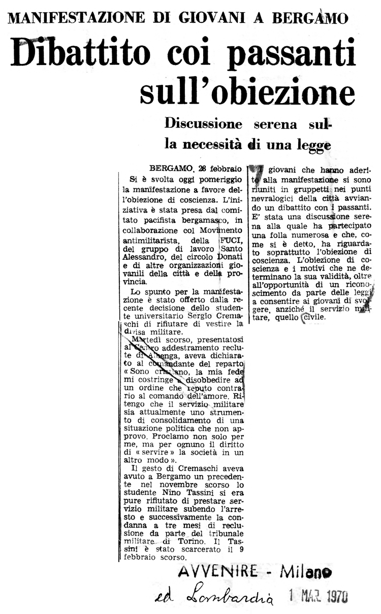 26 febbraio 1970 Un altro bergamasco mette in atto l'obiezione di coscienza (Sergio Cremaschi) |