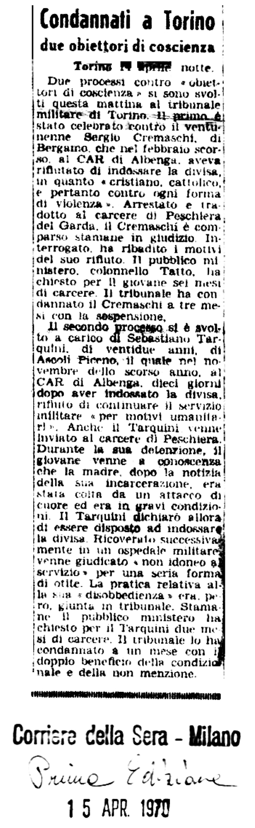 15 aprile 1970 Per rifiuto della divisa Condannati due obiettori di coscienza Tre mesi ad uno, un mese all'altro |