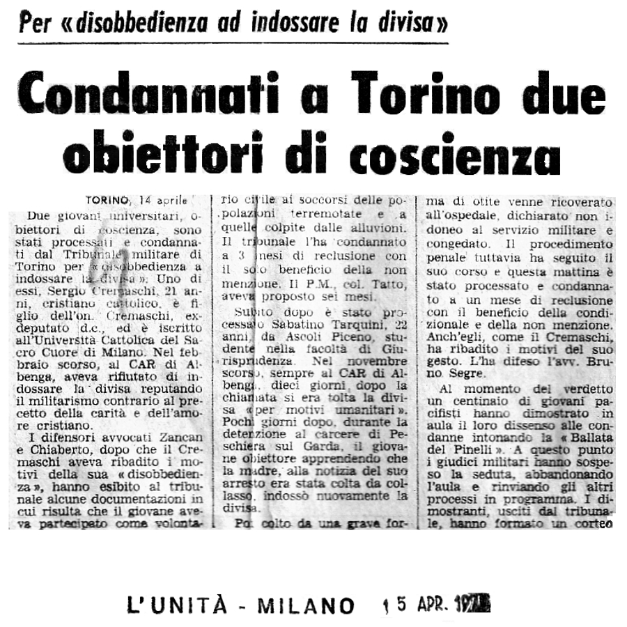 15 aprile 1970 Per disobbedienza ad indossare la divisa Condannati a Torino due obiettori di coscienza |