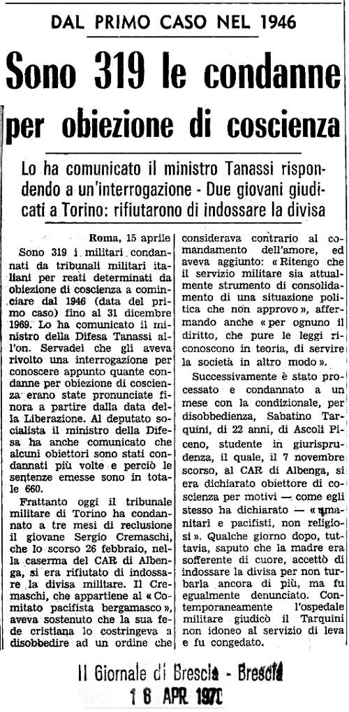 16 aprile 1970 Secondo il Ministero della Difesa Dalla Liberazione a oggi più di 600 condanne per obiezione di coscienza A Torino sono stati condannati altri due giovani che avevano rifiutato di indossare l'uniforne |