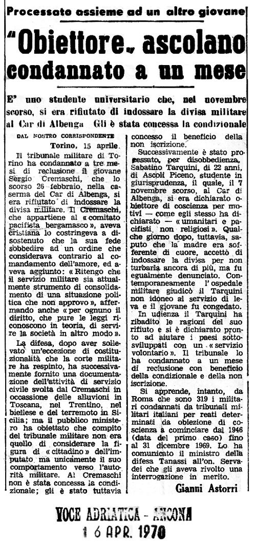 16 aprile 1970 Processato assieme ad un altro giovane "Obiettore" ascolano condannato a un mese E' uno studente universitario che, nel novembre scorso, si era rifiutato di indossare la divisa militare al Car di Albenga. Gli è stata concessa la condizionale |