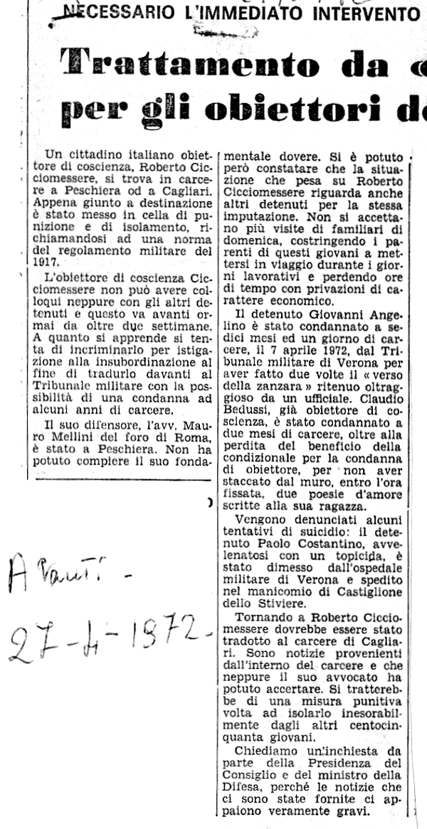 27 aprile 1972 Trattamento da ... per gli obiettori d... Denuncia del trattamento a cui vengono sottoposti gli obiettori nelle carceri militari |