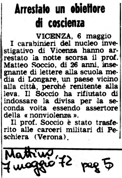 7 maggio 1972 Arrestato un obiettore di coscienza Arresto di Matteo Soccio |