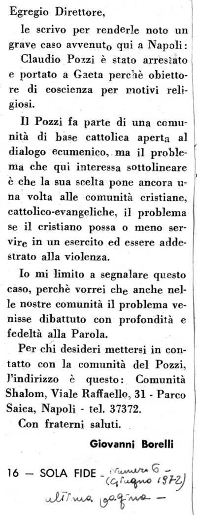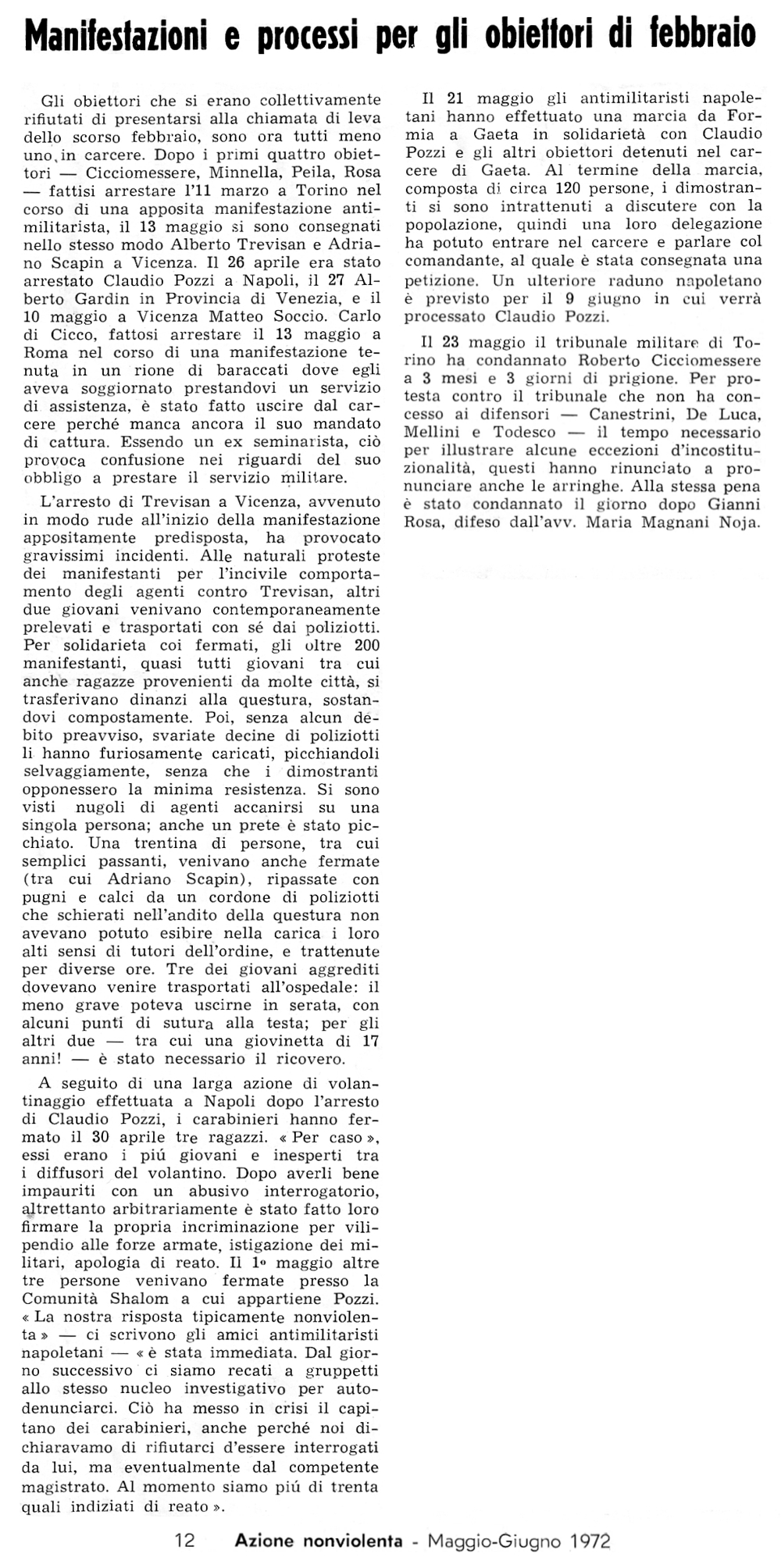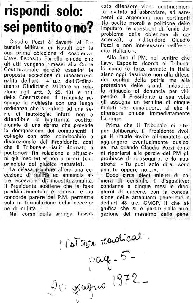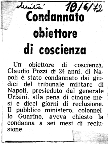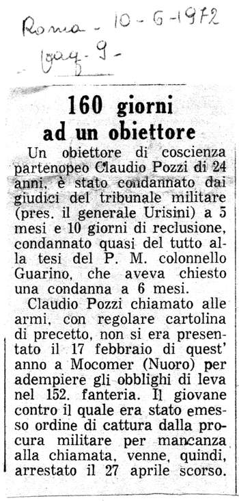 1972 Con una singolare motivazione Tre mesi (e la condizionale) a un obiettore di coscienza Riporta anche notizie del proccesso a Claudio Pozzi |