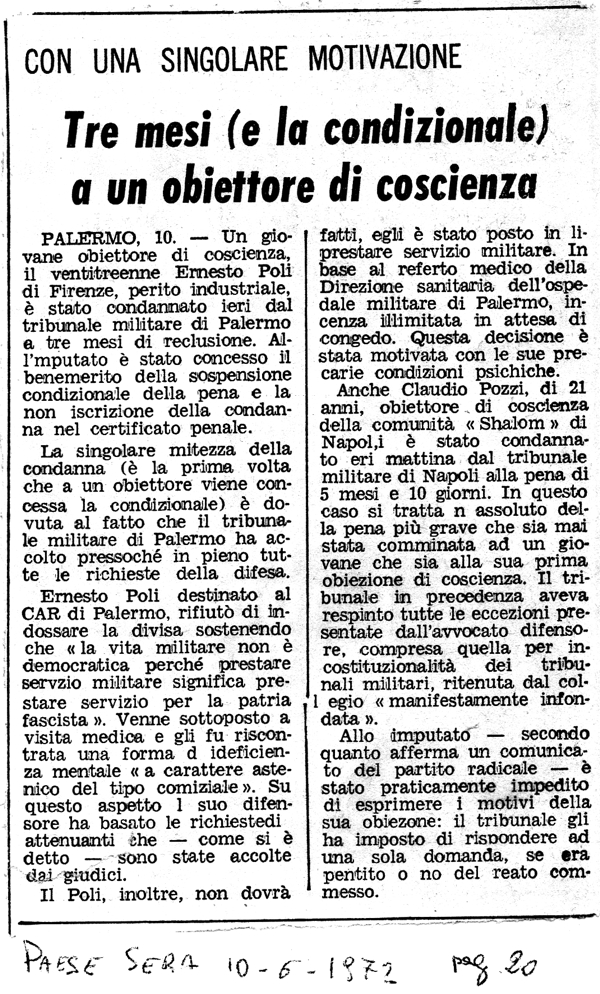 1972 La più grave pena per questo reato Obiettore di coscienza a Napoli condannato a 5 mesi di carcere, Un'altra condanna a Palermo: tre mesi a un fiorentino di 23 anni, Rifiutò la divisa «per non prestare servizio per la patria fascista» |