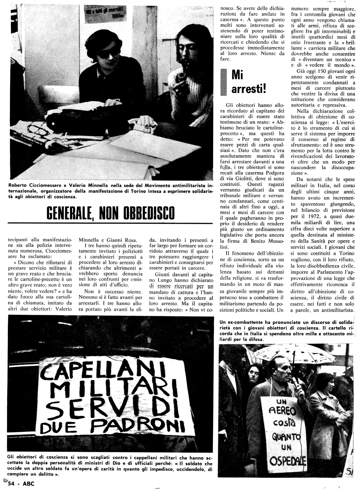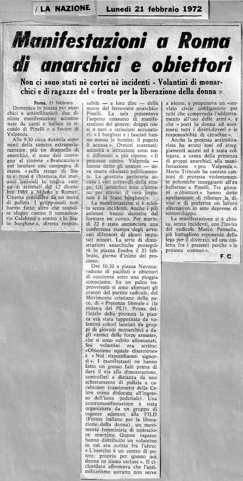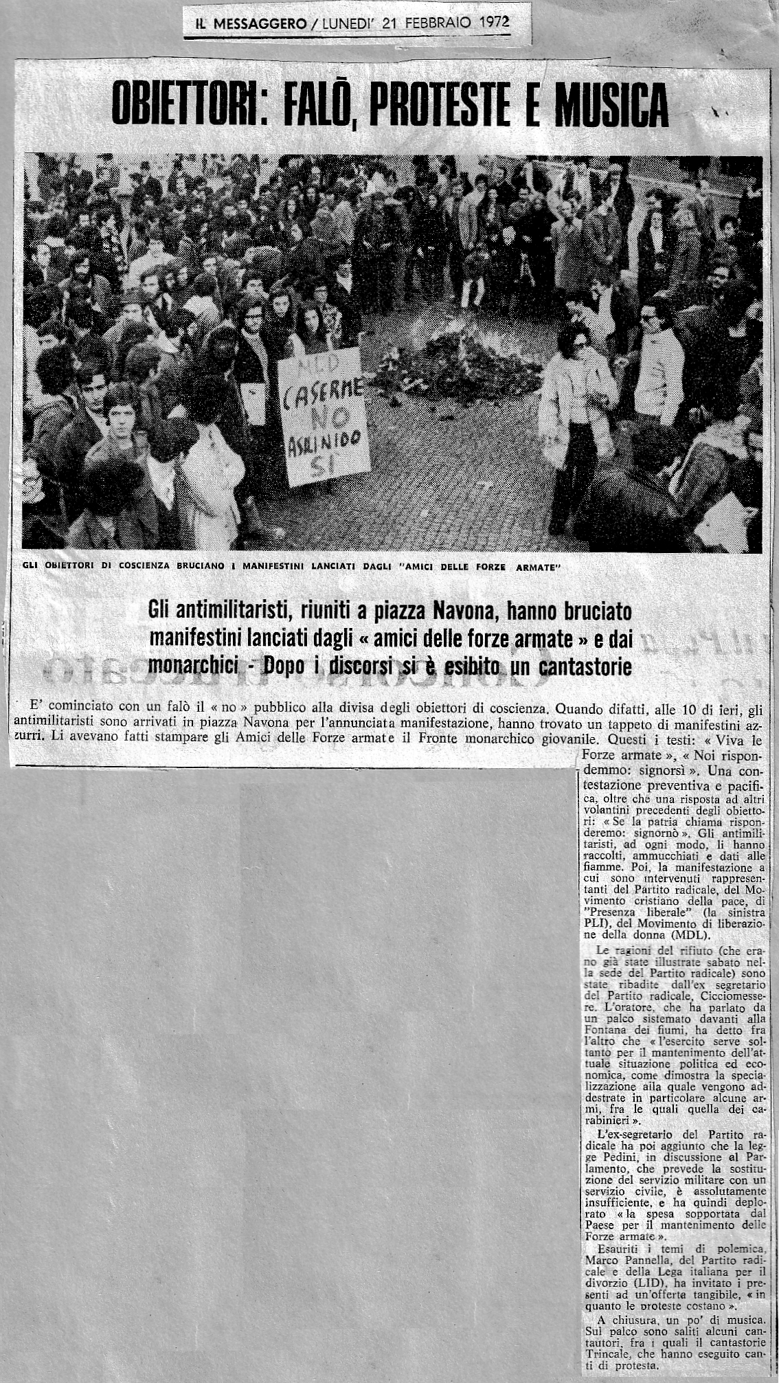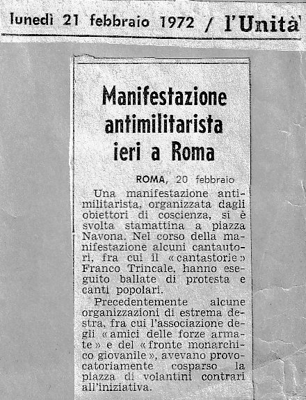 20 febbraio 1972 Roma, manifestazione in Piazza Navona durante la quale nove giovani dichiarano la loro volontà di rifiutare il servizio militare ed affrontare il carcere. Prima di iniziare vengono bruciati volantini precedentemente lanciati dagli "amicidelle Forze Armate" Così ne hanno parlato alcuni giornali ... |