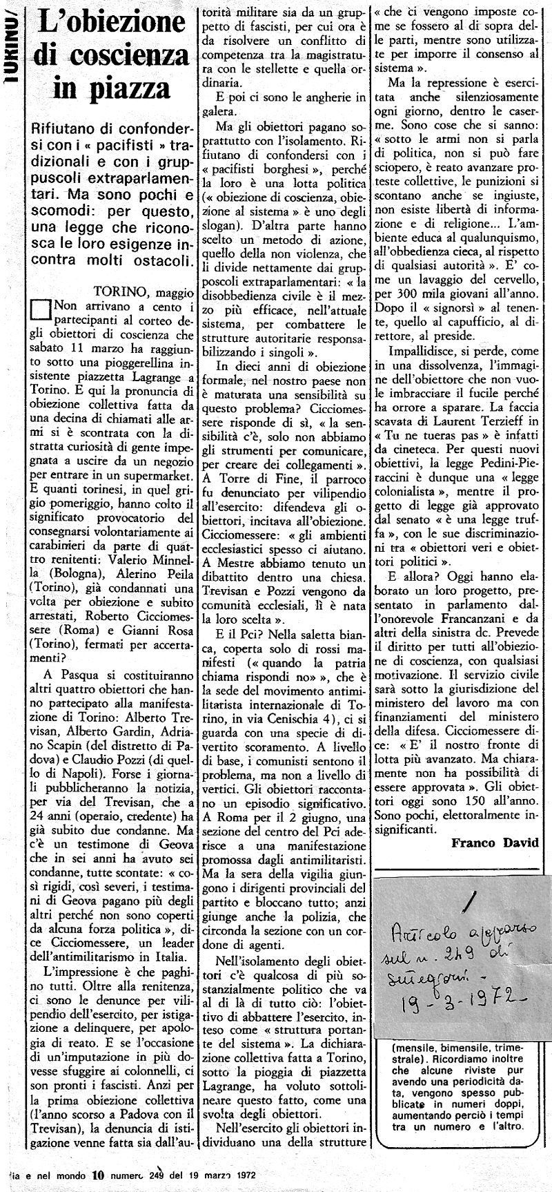 19 marzo 1972 Articolo su Settegiorni n. 249 sulla manifestazione degli obiettori in piazza Lagrange a Torino |