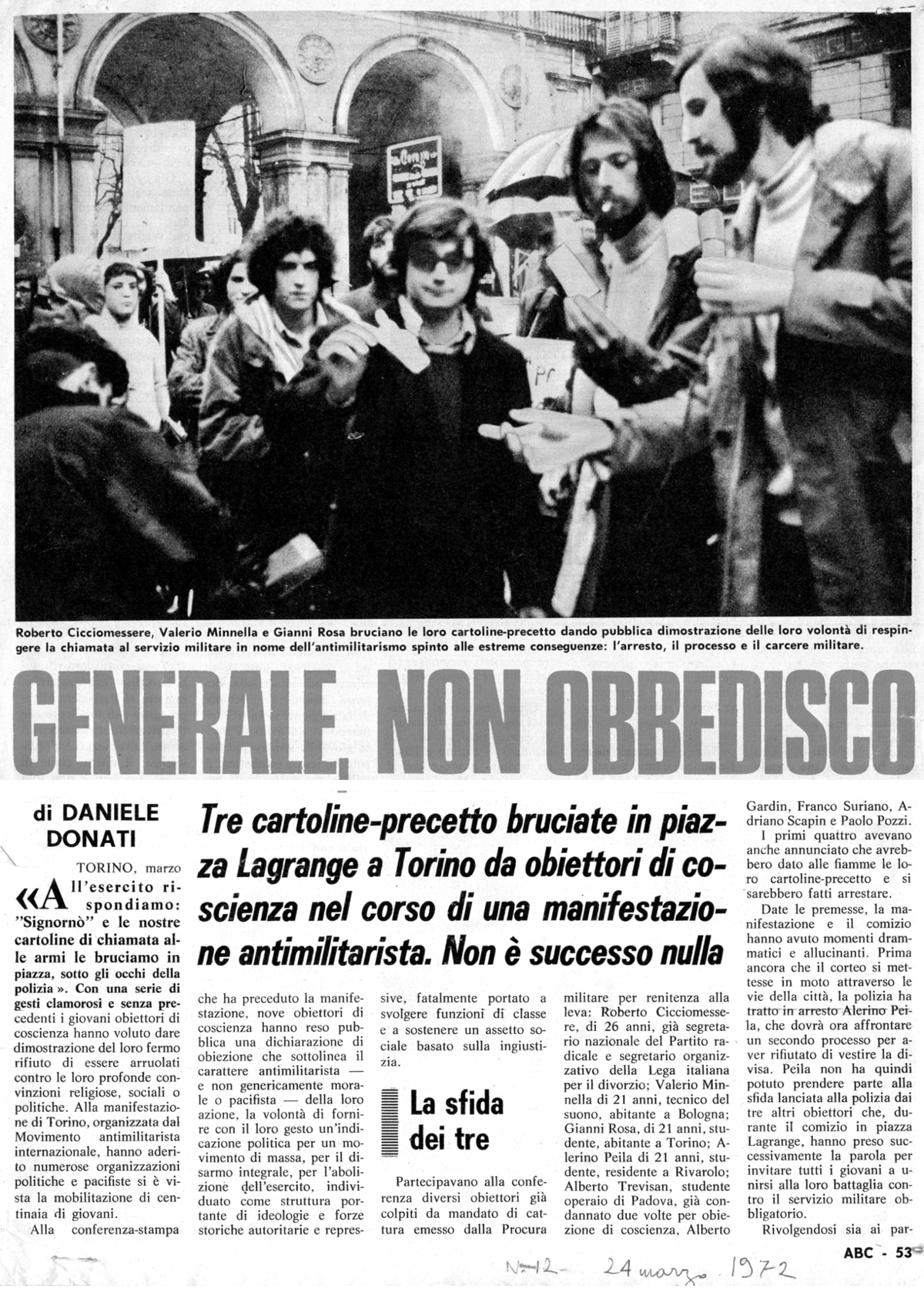 11 marzo 1972 A Torino, in piazza Lagrange, si svolge una manifestazione antimilitarista durante la quale gli obiettori Roberto Cicciomessere, Valerio Minnella e Gianni Rosa - che avevano sottoscritto la dichiarazione collettiva del 20 febbraio in Piazza Navona a Roma - bruciano le cartoline precetto. (ingrandisci le immagini per leggere gli articoli) |