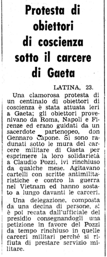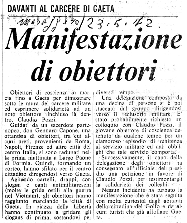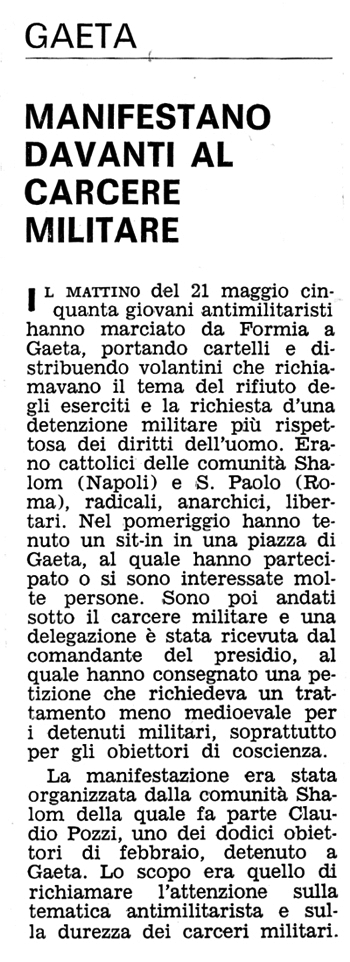1972 Si svolge una marcia della pace da Formia fino al carcere militare di Gaeta dove è detenuto dal 21 aprile l'obiettore di coscienza cattolico Claudio Pozzi. Vi partecipano gruppi provenienti da varie parti d'Italia: da Roma vengono la comunità di S. Paolo, il Partito Radicale (presente anche Marco Pannella), il MIR e il gruppo antimilitarista; da Firenze la comunità della Resurrezione; inoltre gruppi provengono da Terracina e Napoli. Durante la marcia si distribuiscono volantini (testo) e vengono scanditi slogan del tipo “Obiettori liberi”, “Claudio libero”, “Sì all’obiezione di coscienza”, “Militare fallimento, obiettore sii contento”, “Generali dentro, obiettori fuori”, “I tribunali militari sono anticostituzionali”, “Pane, lavoro, giustizia e libertà”, “Le spese militari servono ai padroni”, “Nixon boia”, “Via la Nato dall’Italia, via l’Italia dalla Nato”, “No alle spese militari, sì alle case popolari”, “Non stateci a guardare, venite a marciare”, “Più case, più scuole, più ospedali, no caserme”. In un giardino pubblico i marciatori fanno un sit-in con discussione alla quale partecipano anche abitanti di Gaeta, inoltre, intonano canti antimilitaristi e di pace (testi). Una delegazione porta al comandante del carcere una mozione. Resoconto tratto dal diario della Comunità Shalom e pubblicato nel libro Uno spicchio di cielo dietro le sbarre, pagg. 177-179 (vedi bibliografia). |