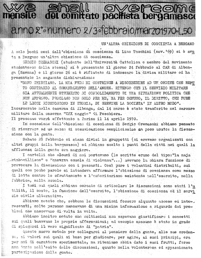 26 febbraio 1970 Un altro bergamasco mette in atto l'obiezione di coscienza (Sergio Cremaschi) |