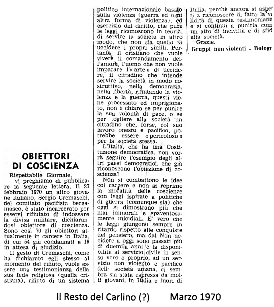 1° marzo 1970 Sergio Cremaschi, del Comitato Pacifista Bergamasco, si è rifiutato di prestare il servizio militare Immagine - Testo |