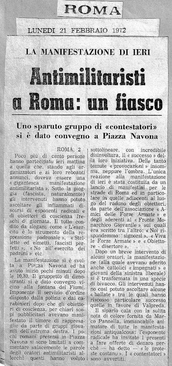 20 febbraio 1972 Roma, manifestazione in Piazza Navona durante la quale nove giovani dichiarano la loro volontà di rifiutare il servizio militare ed affrontare il carcere. Prima di iniziare vengono bruciati volantini precedentemente lanciati dagli "amicidelle Forze Armate" Così ne hanno parlato alcuni giornali ... |
